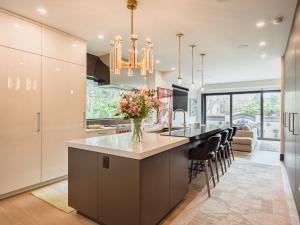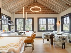 The heart of the home is the kitchen, a thoughtfully curated space featuring a picturesque window, hidden butler’s pantry, and a discreet warming drawer that conveniently services the adjacent formal dining area. Tradition gives way to airy, as reengineered interiors supported by steel I-beams that span from the basement to the roofline create flowing, light-filled, and voluminous living spaces that are as functional and elegant.